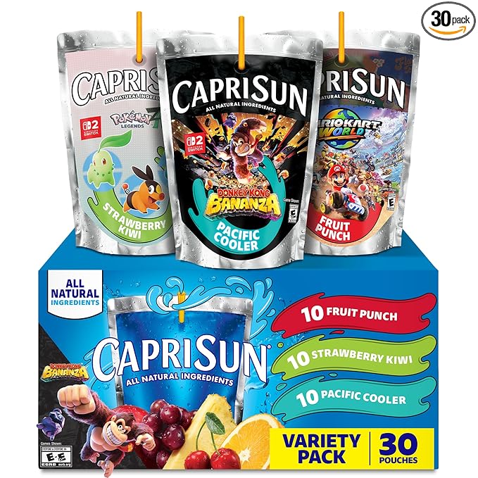 Grab a little juicy freedom with Capri Sun Fruit Punch, Strawberry Kiwi and Pacific Cooler Flavored Juice Drink Blends. Kids will love the taste of our Capri Sun, made with a new and improved formula. Made with the all-natural sweetener, monk fruit, our juice drink blends variety pack features an assortment of fun flavors that are joyfully refreshing. We never add artificial flavors, colors, preservatives or high-fructose corn syrup to our pouches. Our 30 count variety pack contains 10 Fruit Punch, 10 Strawberry Kiwi and 10 Pacific Cooler flavored juices. Each 6 fluid ounce pouch comes with a straw so they’re ready for kids to squeeze and sip. Unleash kids’ independence with a ready-to-drink Capri Sun. Find Pokemon Legends, Donkey Kong Bananza and Mario Kart World on our limited-edition packs — get yours while they last!